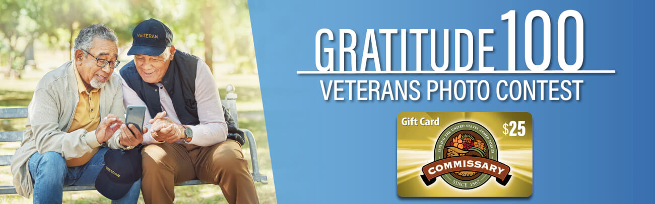Submit a photo of a veteran (it can be you, a family member, or a loved one) for a chance to WIN a $25 Commissary Gift Card (100 Lucky Winners possible).