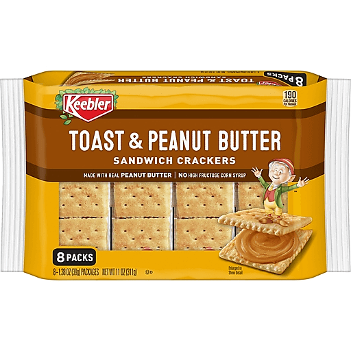 Keebler Toast and Peanut Butter sandwich crackers are the real deal. These conveniently packaged crackers feature a tempting combination of crunchy crackers sandwiched around a tasty filling made with real peanut butter. It's total snacking satisfaction! Made with no high fructose corn syrup, these crunchy, flaky sandwich crackers pack a huge punch of flavor that's irresistible for anytime snack cravings; Keebler Toast and Peanut Butter sandwich crackers are a great snack to pass out at game time, add to a party spread, pack in a school lunch, enjoy as an after school treat, grab for late-night munching, and more. The peanut-buttery options are endless. Toss a package of Keebler sandwich crackers in your tote to bring along on field trips, trips to the park, or even while you're running everyday errands. You'll love the one-of-a-kind flavor of real peanut butter in every tasty package of Keebler Toast and Peanut Butter sandwich crackers.