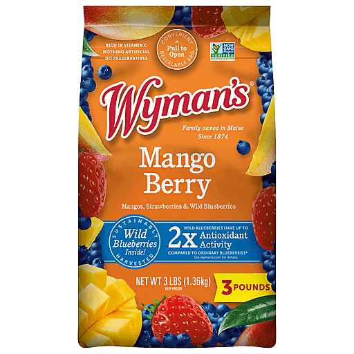 Wymans of Maine No Sugar Added Non-GMO Wild Blues Mango Berry Fresh Frozen Blend Mixed Fruits 3 lb bag