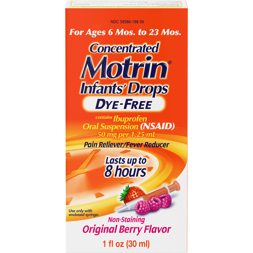Motrin Dye-Free Pain Reliever and Fever Reducer Original Berry Flavor Concentrated Infants Drops Liquid Medicine 100 mg per 5 ml Ibuprofen 1 fl oz