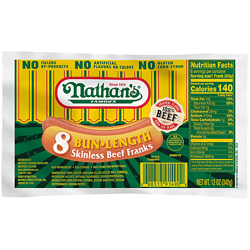 Nathan's Famous Gluten-free Bun-Length Skinless 100% Beef Franks 8 ct 14 oz package
