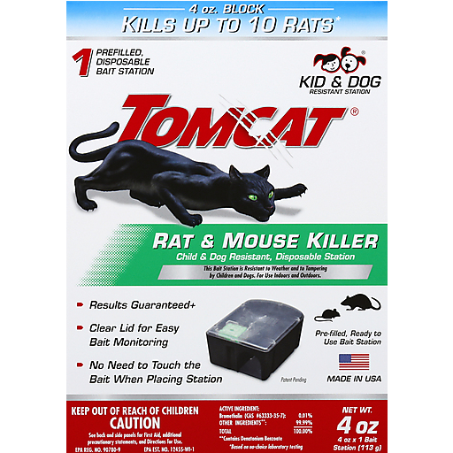 Net wt. 4 oz. 4 oz x bait station (113 g). 4 oz block. Kills up to 10 rats (Based on no-choice laboratory testing). 1 prefilled disposable bait station. Kid & dog resistant station. Child & dog resistant, disposable station. This bait station is resistant to weather and to tampering by children and dogs. For use indoors and outdoors. Results guaranteed (Tomcat Brands Guarantee: If for any reason you, the consumer, are not satisfied with this product, mail us your original proof of purchase to obtain a full refund of your purchase price). Clear lid for easy bait monitoring. No need to touch the bait when placing station. Pre-filled, ready to use bait station. Kills rats & house mice. Questions or comments? Call 1-877-332-0755. www.tomcat.com. Can be used horizontally or vertically. See-thru lid for easy bait monitoring. Disposable. Can be used in a variety of locations. Behind appliances. In corners. Garages. Basements. Attics. Exterior of homes. All must be consistent with the use restrictions in the directions for use section of this label. Made in USA.